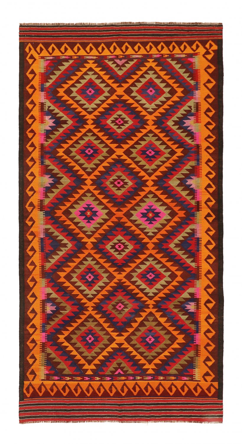 Orientalny kilim łączy płaski splot z naturalną wełną – lekki, elastyczny dywan, który łatwo ułożyć w korytarzu, salonie lub pod stołem jadalnianym. Smukły profil świetnie sprawdza się także przy warstwowaniu na większym dywanie.